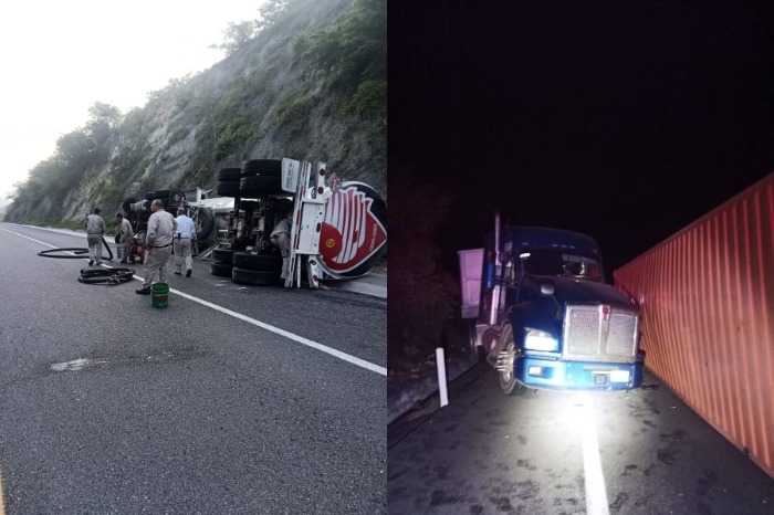 Primeramente, en el kilómetro 239+800, un camión pipa de PEMEX, se salió de la carpeta asfáltica y acabó volcado en la cuneta pluvial, por lo que se estableció paso alterno.